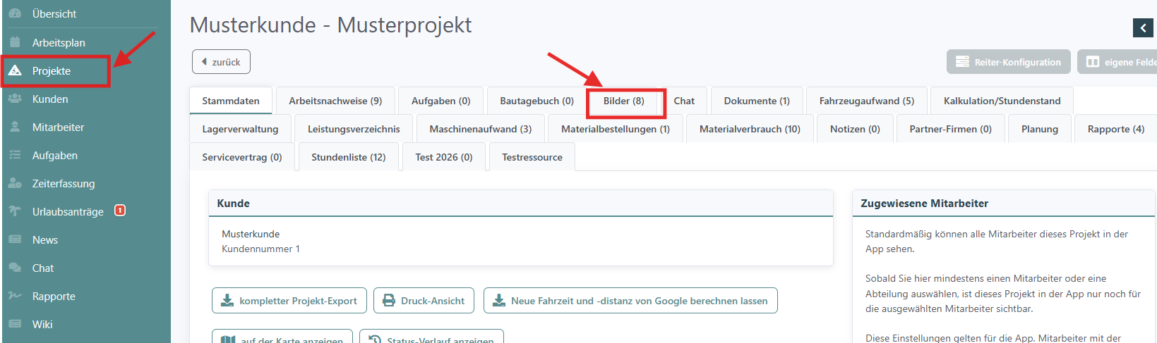 Jedes Foto/Bild wird in dem ausgewählten Projekt zugeordnet und im Reiter »Bilder«, mit Angabe der Quelle, gespeichert. Siehe Beispiele: