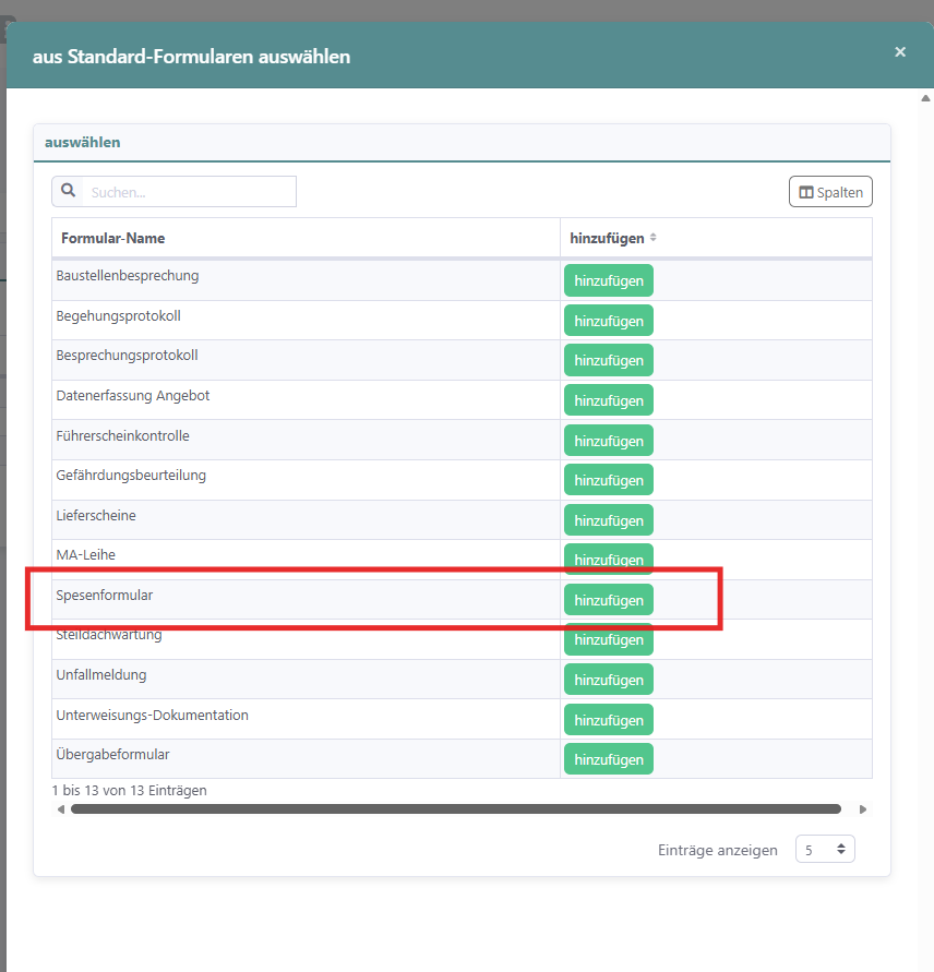 Nun öffnet sich ein Fenster, in dem Sie eines der Standard-Formulare auswählen können. In diesem Fall das "Spesenformular". Klicken Sie auf "hinzufügen"