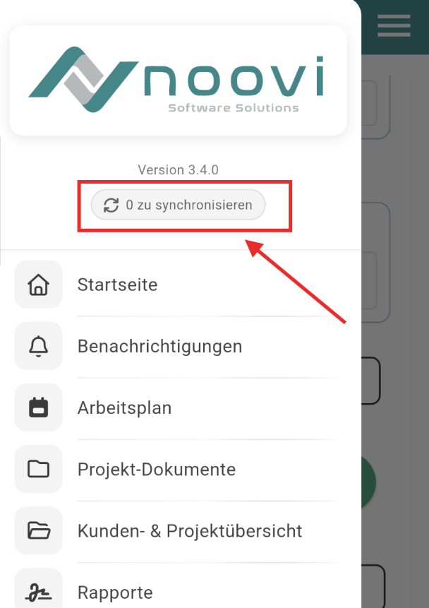 Wenn Daten, wie z.B. Rapporte vom Handy oder Tablet nicht ins Verwaltungssystem übertragen werden, müssten Sie einmal auf dem Absender-Gerät schauen, ob dort noch zu sendende Daten in der Warteschleife hängen. Dafür klicken Sie in der App auf das Burgermenü und schauen, ob bei "Daten zu synchronisieren" eine Zahl steht: