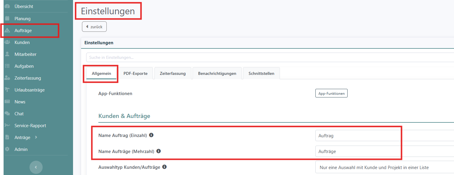 Gehen Sie im Verwaltungssystem auf "Admin" > "Einstellungen" > "Allgemein". Hier finden Sie die Punkte "Name Projekt (Einzahl)" und "Name Projekte (Mehrzahl)".