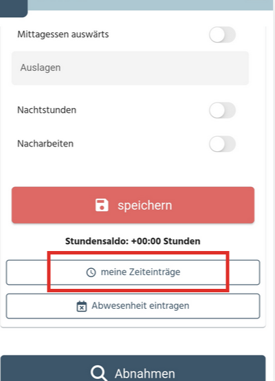 Die Mitarbeiter können dann auf der Startseite der App über den Punkt "meine Zeiteinträge" Ihre Zeiten einsehen und bearbeiten: