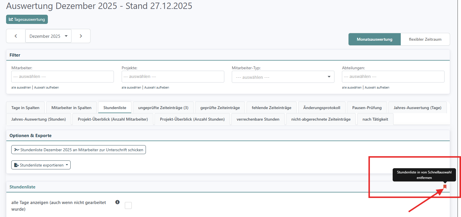 Um die Monatsauswertung als Schnellzugriff auf dem Dashboard hinzuzufügen, gehen Sie auf "Zeiterfassung" > "Auswertungen" > wählen Sie z.B. "Stundenliste". Klicken Sie dann auf das Lesezeichen: