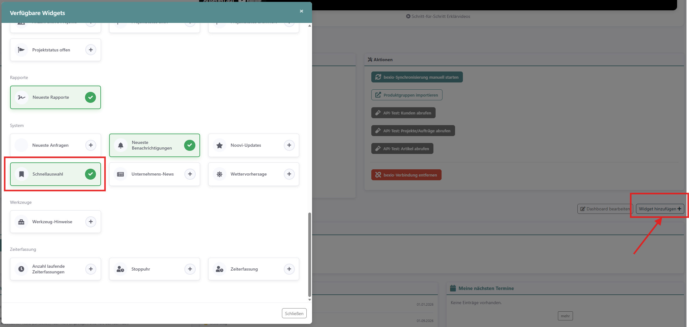 Für viele unserer Funktionen können Sie einen Schnellzugriff im Dashboard einrichten.