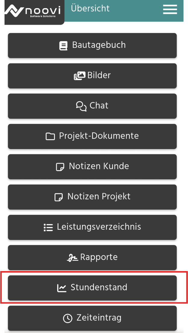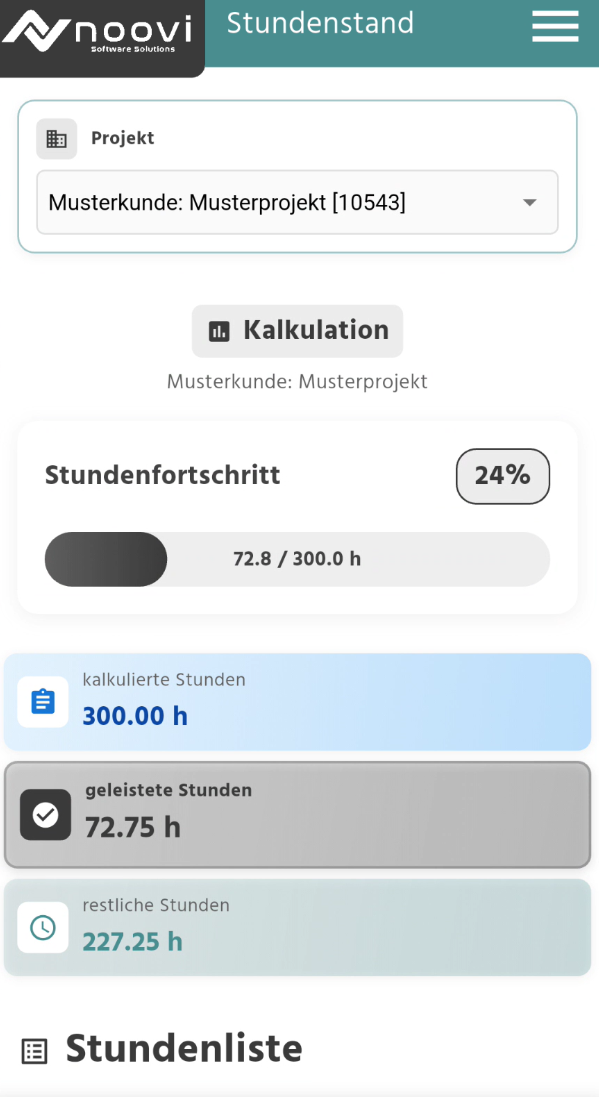 Mit dieser Einstellung können Ihre Mitarbeiter in der App auf "Kunden- & Projektübersicht" gehen und haben dort den Knopf "Stundenstand" durch den Sie die kalkulierten Stunden einsehen können: