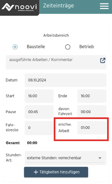 Ihre Mitarbeiter können nun in der Zeiterfassung die entsprechende Zeit für die erschwerten Arbeiten in der App eintragen: