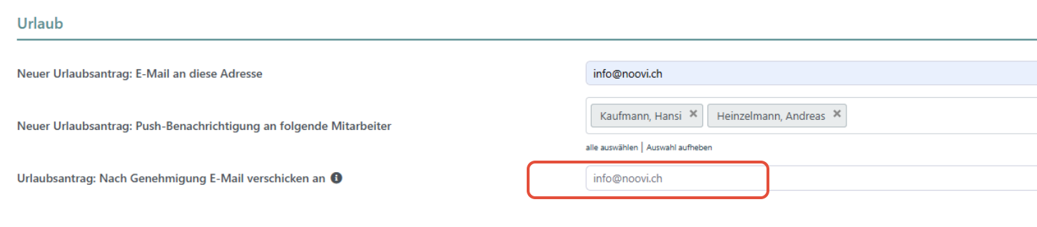 Tragen Sie anschließend im Feld "Urlaubsantrag: Nach Genehmigung E-Mail verschicken an" die E-Mail ein, die eine Benachrichtigung über genehmigte Urlaubsanträge erhalten soll.