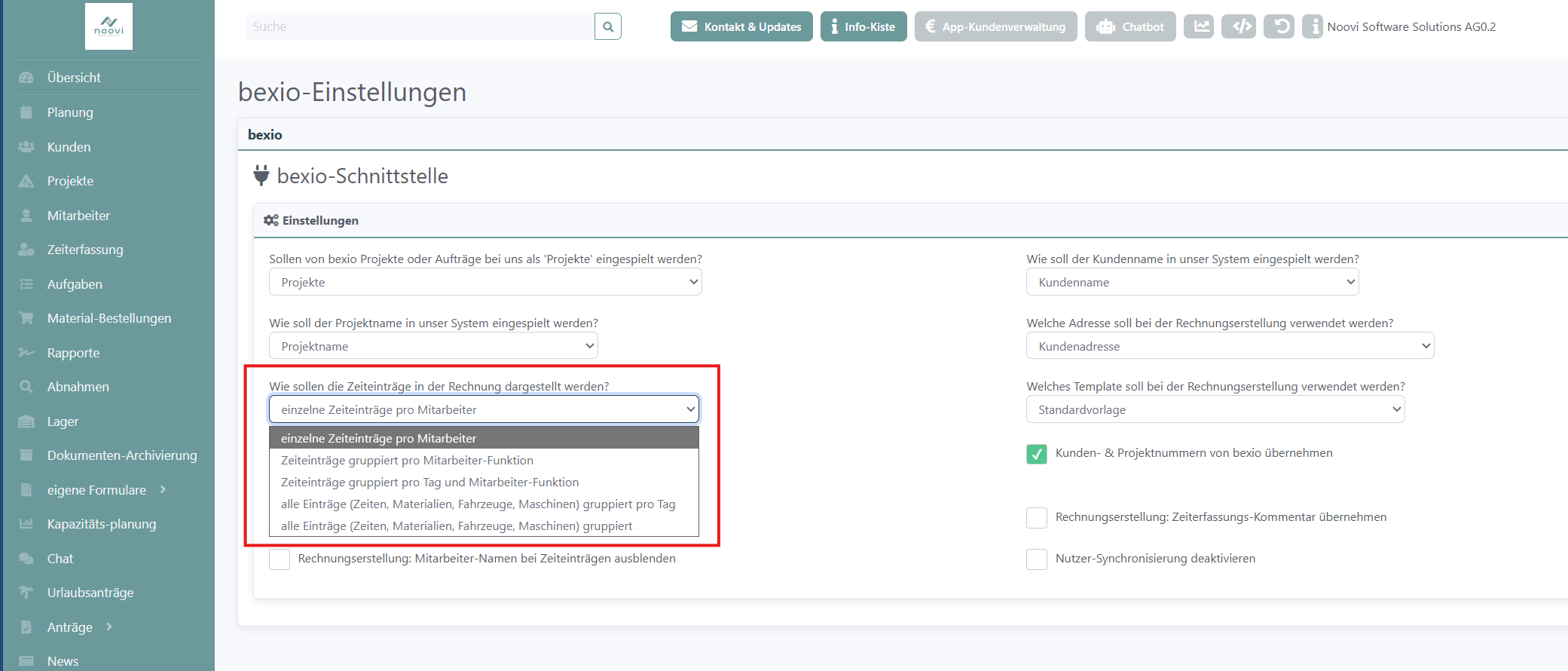 Für bexio haben gibt es neue Rechnungs-Optionen. Anbei sehen Sie, wie sich diese Optionen auf die Rechnungen auswirken. Gehen sie dazu wie folgt vor: Admin--> Schnittstellen --> bexio-Einstellungen