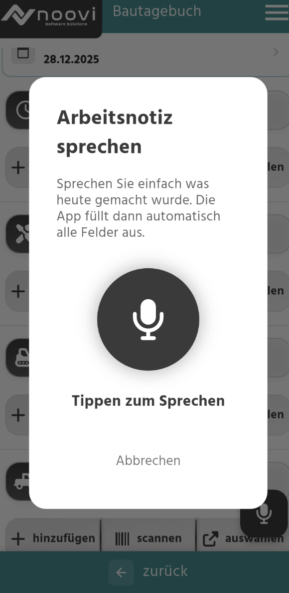 Mit der KI-Spracheingabe können Sie Formulare in der App einfach durch Sprechen ausfüllen. Sie nehmen eine kurze Sprachnotiz auf, die KI analysiert Ihre Aussage und füllt automatisch die entsprechenden Felder aus.