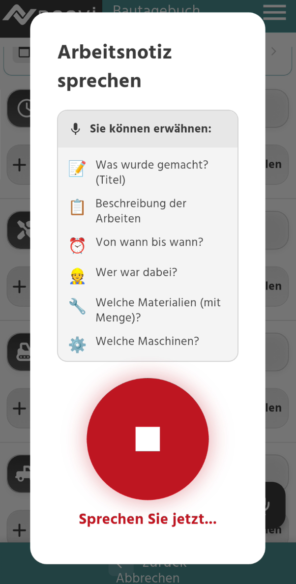 - Sprechen Sie Ihre Arbeitsnotiz frei ein - beschreiben Sie einfach, was heute gemacht wurde