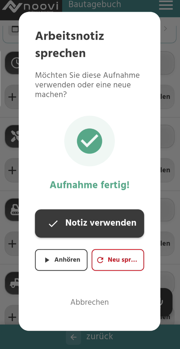 - Prüfen Sie die Aufnahme (optional anhören) und bestätigen Sie mit "Notiz verwenden"