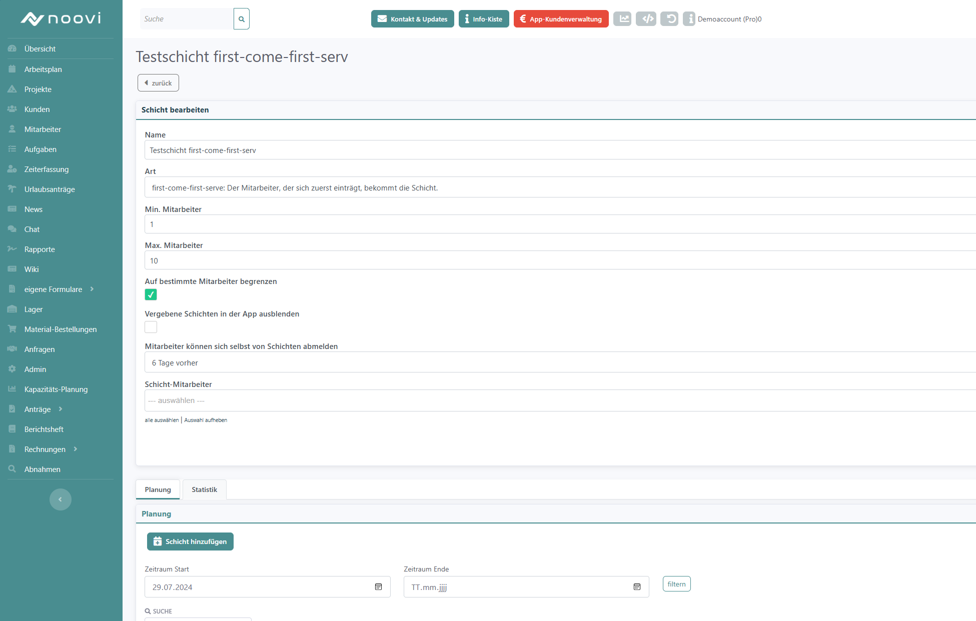 Zudem können Sie auswählen, ob nur bestimmte Mitarbeiter auf die Schichten zugreifen können, hierfür setzen Sie den Haken bei "auf bestimmte Mitarbeiter begrenzen". Anschließend können Sie die Mitarbeiter eintragen, auf die die Schicht begrenzt werden soll.