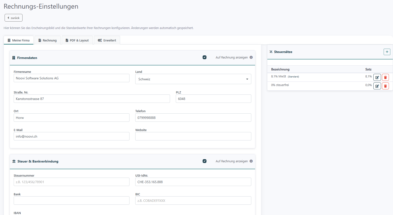 Hier hinterlegen Sie die Daten, die auf jeder Rechnung erscheinen.